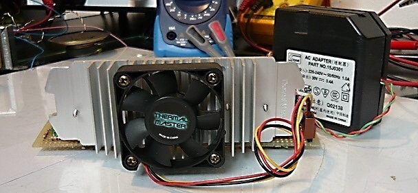 Considerando pero' che sulla basetta ci sono tre regolatori e due bjt, ho pensato fosse necessario fornire un idoneo dissipatore e ne ho trovato uno di un vecchio Pentium che ho provveduto a montare, dotando ogni regolatore e bjt di rondelle plastiche ed isolatori.