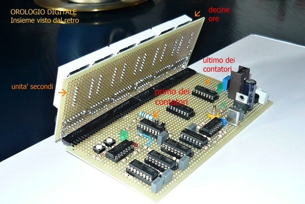 e' facile rendersi conto che il primo HCF4518 ( a destra nello schema ) che riceve il clock e serve unita' e decine dei secondi, in pratica (vedi foto) verra' impiegato per comandare le unita' e decine delle ore.