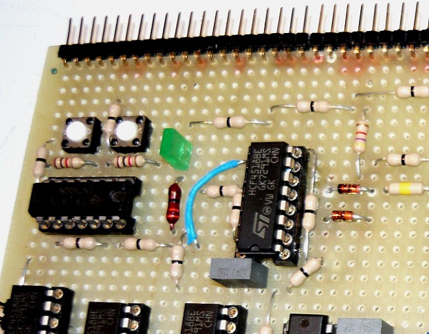 Qui e' possibile vedere che il pin 1 e' disposto in basso a destra e l'integrato riceve l'impulso di clock ( tramite il cavo azzurro provvisorio) sul pin 9.
