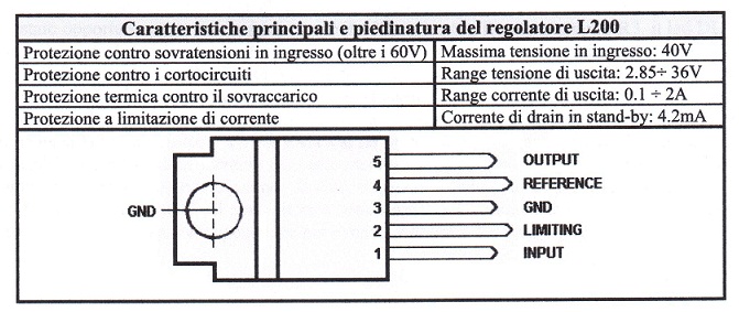L 200 e' un po' meno complesso del LM723; resta comunque un'ottimo regolatore sia in tensione che in corrente e si presta a numerose applicazioni, prima fra queste la ricarica delle piccole batterie al piombo.