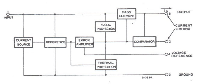 Il transistor interno (all'estrema destra) costituisce l'elemento serie che fa capo ai terminali VC (pin 11) e OUT (pin 10), mentre l'amplificatore operazionale, collegato alla base del transistor stesso, costituisce l'amplificatore d'errore ovvero il vero e proprio stabilizzatore interno dell'integrato.