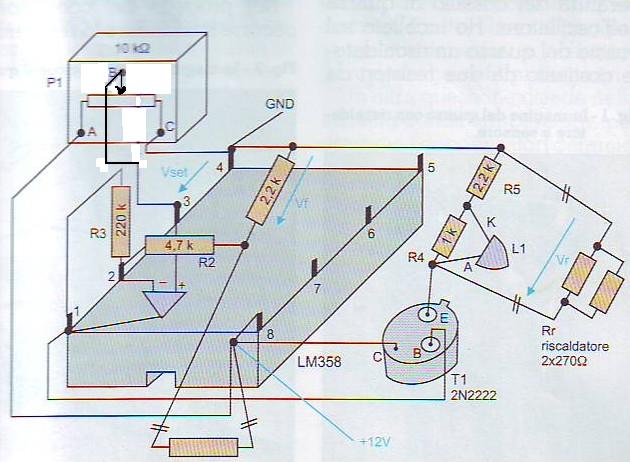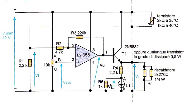 Elenco componenti R1,R4 2,2 kΩ : Tutte le R sono da ¼ W. R2 4,7 kΩ R3 220 kΩ R5 1 kΩ Rr n.2 270 Ω in parallelo. P1 potenziometro trimmer 10 kΩ Rs termistore NTC da 2,2 kΩ +/- 5% a 25 C° p.es.: Farnell order code 118-7025. Ic1 LM358, oppure KA358 package 8DIP T1 NPN con dissipazione 0,8 W, p.es: BSX61, 2N2219A, 2N1893, 2N5682. L1 LED qualunque.