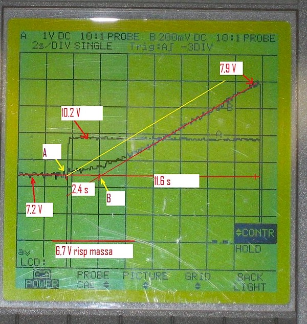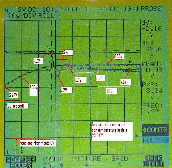 Nella fig.6 è riportata l'immagine all'oscilloscopio dell'andamento della tensione di feedback Vf e della tensione del riscaldatore Vr durante il transitorio che si verifica quando si alimenta il sistema. Si osserva la presenza di una modesta oscillazione smorzata della tensione del riscaldatore con un semiperiodo di circa 15 secondi. Detta oscillazione è dovuta al fatto che il sensore di temperatura è vicino, ma non coincidente con il riscaldatore. Capita un fenomeno simile quando si fa la doccia: inizialmente si apre il miscelatore a metà e l'acqua è solo tiepida, per averla più calda si ruota il miscelatore, la temperatura dell'acqua non aumenta subito perché l'acqua deve percorrere il tubo dal miscelatore all'ugello, si continua ad agire sul miscelatore finché l'acqua, quando arriva, scotta e si deve ruotare il miscelatore in senso contrario.