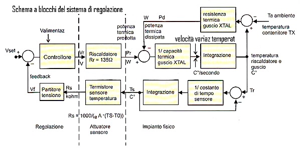 Nel progetto del controllore, occorre trasformare la resistenza del sensore in una tensione elettrica che viene confrontata con la tensione corrispondente alla temperatura voluta: in funzione della differenza, si controlla la corrente nel riscaldatore che influisce sulla temperatura del quarzo. Le variazioni di calore provenienti dall'esterno sono disturbi in quanto tendono a influire sulla temperatura, ma il regolatore la mantiene costante. Il riscaldatore deve fornire sufficiente calore quando la temperatura ambiente è bassa ( circa 15 C°), ma erogarne una quantità ridotta quando la temperatura ambiente è elevata ( circa 35 C°). Ho verificato, applicando una potenza riscaldante di 0,5 W con una temperatura ambiente 22 C° e misurando a regime una temperatura maggiore di 55 C°, che è possibile stabilizzare attorno a 45 C° per una temperatura compresa fra 15 e 35 C°.
