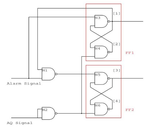 Il circuito va inizializzato con AQ Signal asserito, e Alarm Signal deasserito. La coppia di uscite dei flip-flop può assumere solamente 3 valori 10, 11, 00, che rispettivamente corrispondo alla condizioni di normalità, allarme ed allarme persistente.
