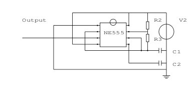 Questa parte di circuito, schematizzato in Figura 3 serve a generare un segnale pulsante, spesso utilizzato come segnale di clock in molti altri circuiti. Non analizzeremo in dettaglio il funzionamento poiché si discosterebbe in modo significativo dall'argomento trattato, ma ci limiteremo a studiare la configurazione, in modalità astabile, dell'integrato NE555 che utilizzeremo a tale scopo. Il segnale intermittente verrà asserito sulla linea Output.