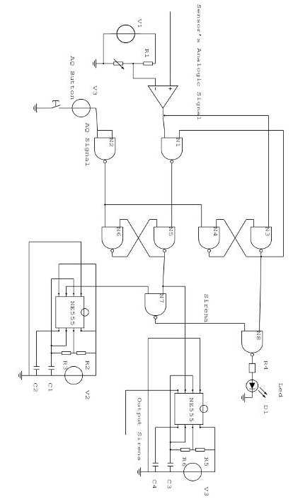 Per poter realizzare un circuito del genere, è conveniente servirsi di un software di simulazione (Micro-Cap 9.0) per controllarne la correttezza in fase progettuale. Utilizzeremo un approccio top-down suddividendo il circuito completo, in sottocircuiti più semplici, in modo da consentirci una realizzazione ed interpretazione più semplice. L'intera circuiteria si dovrà occupare di generare un segnale logico di allarme, rilevare tale segnale e memorizzarlo, riconoscere il segnale di acquisizione, temporizzare l'attivazione della sirena per evitare che si prolunghi nel tempo. Il cuore di tutto il sistema è la parte circuitale che si occupa di rilevare e memorizzare il segnale di allarme da parte di uno o più sensori. La memorizzazione è molto importante, specie nel caso di segnali di allarme di breve durata; è necessario infatti che l'allarme continui a suonare anche in caso di situazioni di allarme brevi nel tempo, sino al riconoscimento AQ; è opportuno inoltre memorizzare anche quest'ultima. Dovremmo disporre anche di un circuito in grado di generare un impulso di tipo onda quadra per consentire a led di lampeggiare (che utilizzeremo anche nella temporizzazione della sirena) e di un ulteriore circuito affinché il segnale generato dal sensore sia un segnale logico. Utilizzeremo dunque due flip-flop per memorizzare i due segnali principali (allarme, AQ); un comparatore per asserire a un livello logico alto il segnale di allarme, quando la tensione prodotta dal sensore utilizzato per rilevare il movimento supera una determinata soglia.
