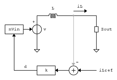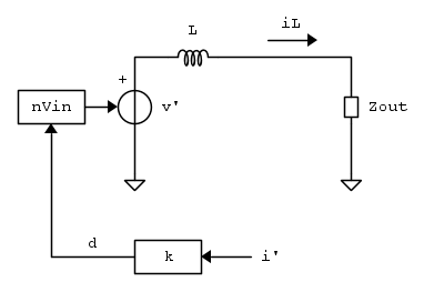 In pratica, con l'espressione del duty-cycle, possiamo disegnare l'anello di corrente al piccolo segnale: il duty eccita l'induttore con una tensione pari a nVin, mentre la corrente sull'induttore è determinata dal guadagno d'anello e dall'impedenza di uscita. Per conoscere l'espressione in anello chiuso del trasferimento che ci interessa (