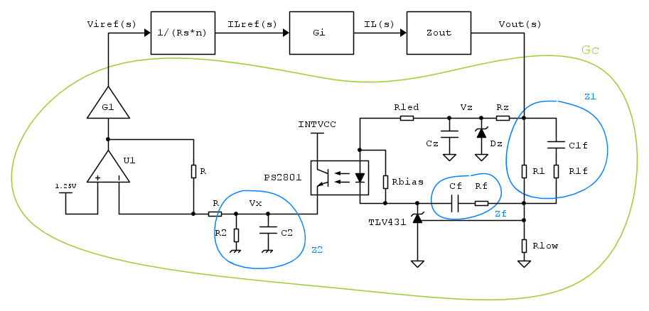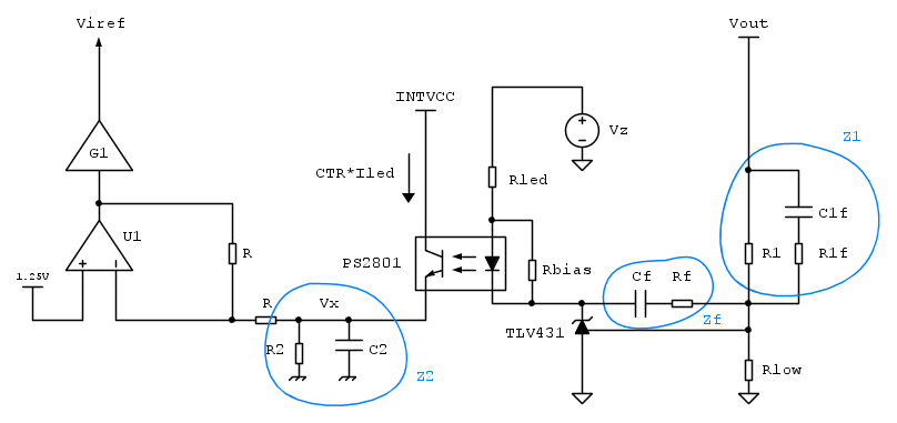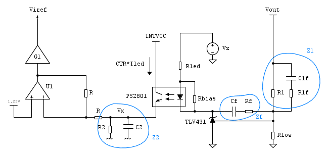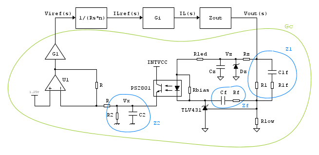 La corrente di piccolo segnale su Z1 è data quindi solo da vout / Z1, ed è la stessa che scorre su Zf: da qui si può ricavare la tensione sul catodo del TLV, e quindi la corrente iled (trascurando la resistenza di bias).
