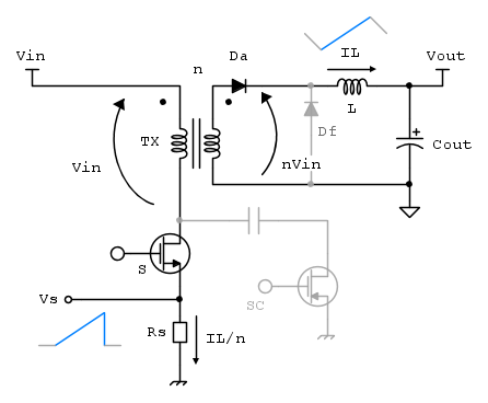 , dove n = Ns / Np è il rapporto di trasformazione di TX. Il secondario è composto da due dispositivi di rettifica che alimentato l'induttore L: quando S è attivo Da è in conduzione, mentre Df conduce nella fase duale (fino a che la corrente in L non arriva a zero). Df è il famoso diodo di freewheeling.