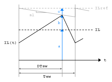 IL,iref può essere scritta come la somma di tre contributi: la corrente media IL (a), metà del ripple di corrente (b) e un pezzo di rampa (c). La rampa, che implementa la compensazione di rampa discussa in precedenza, ha una pendenza di sl A/s. Osservando lo schema circuitale semplificato, questa pendenza è determinata dal generatore di corrente a dente di sega Islope e dalla resistenza R14, che come già discusso può essere immaginato come un dente di sega che si sottrae al riferimento di corrente.