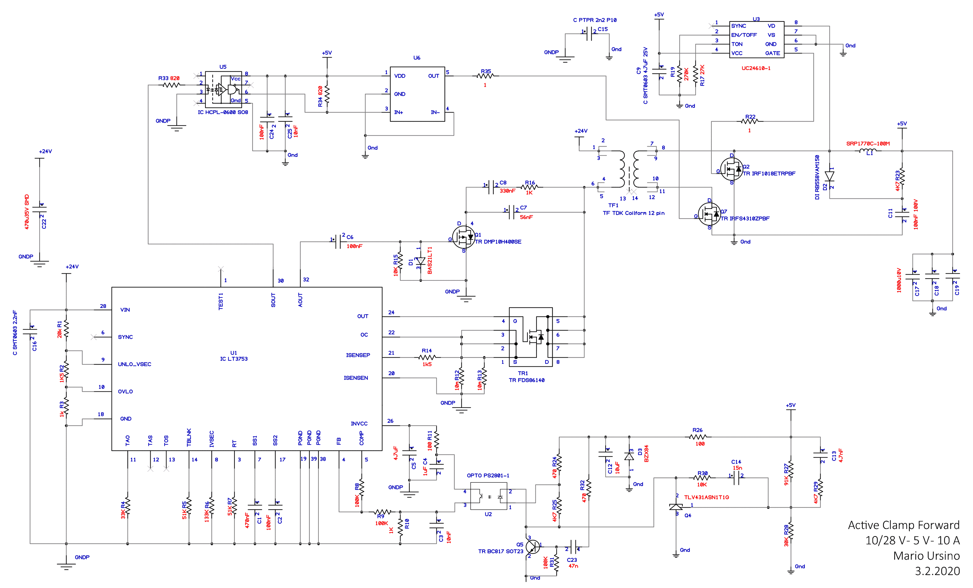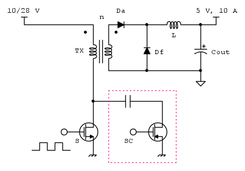 La topologia dell'active clamp forward è riportata di seguito; per una sua descrizione dettagliata rimando alla prima parte dell'articolo, mentre qui ne farò un piccolo riassunto.