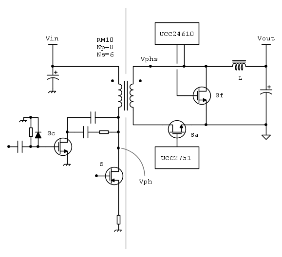 Il convertitore è leggermente diverso rispetto a quanto aticipato: per prima cosa, al secondario non ci sono dei semplici diodi ma si trovato due MOSFET di rettifica con relativi drivers. UCC24610 monitora il drain di Sf implementando un diodo ideale, in pratica accendendo Sf quando la corrente è positiva e spegnendolo quando cambia segno. Questo componente è fondamentale per lasciar entrare il convertitore in modalità DCM, ossia evitando di scaricare l'uscita con correnti di induttore negative a basso carico. Sa è invece pilotato dal primario: idealmente il suo periodo di accensione è lo stesso di S, tuttavia il controller lo accende e spegne con dei ritardi aggiuntivi per motivi di efficienza. Al primario S è ovviamente un NMOS, mentre Sc è un PMOS con una rete di bootstrap. Sia S che Sc sono pilotati da due driver interni al controller, mentre il segnale diretto ad Sa attraversa l'isolamento tramite un optoisolatore, collegandosi poi ad un driver classico.