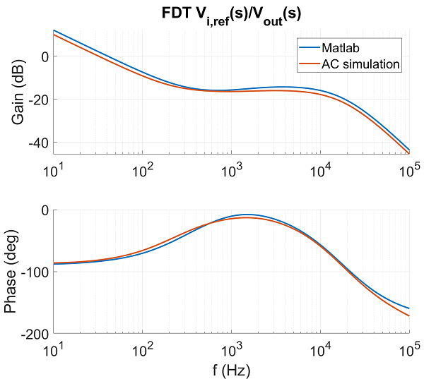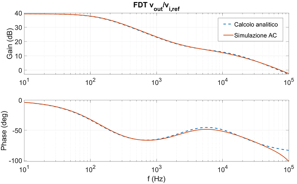 Paragonando la FDT così ottenuta con una simulazione circuitale AC otteniamo un'ottima corrispondenza, sintomo che le semplificazioni hanno senso.