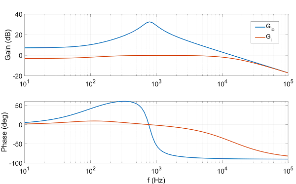 . Di seguito sono riportati i diagrammi di Bode di Gio e Gi con carico in corrente (Zout composta solo dalle capacità di uscita) e con carico resistivo. I diagrammi corrispondono al convertitore in esame, e i parametri sono i seguenti: