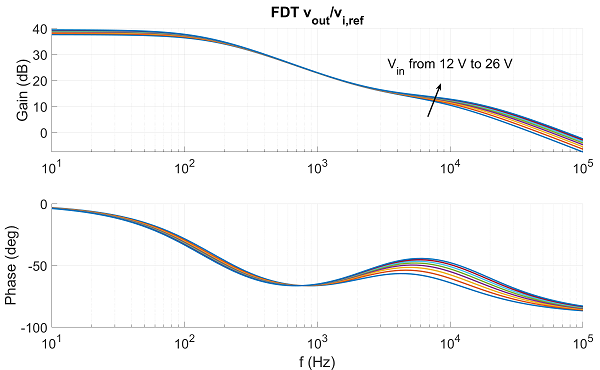 Per concludere, il controllo deve garantire stabilità e performance nel peggiore dei casi: il controllo in corrente ci viene incontro desensibilizzando il loop dalla tensione di ingresso, che è ampiamente variabile in questo caso. Inoltre, l'induttore non può variare la sua induttanza (se non vicino alla saturazione, cosa che va comunque considerata), mentre le variazioni di carico si manifestano solo in bassa frequenza, scomparendo nella FDT in anello chiuso.