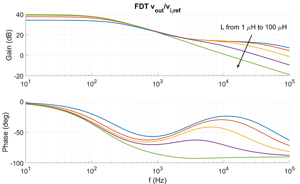 - Il valore di induttanza provoca principalmente una riduzione della banda del convertitore, dato dallo spostamento del polo dell'anello di corrente verso le basse frequenze.