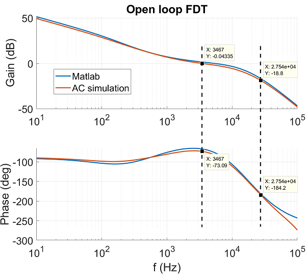 A questo punto possiamo progettare il controllo in modo analitico, sicuri che il circuito non nasconde altre non-idealità nella banda di interesse.