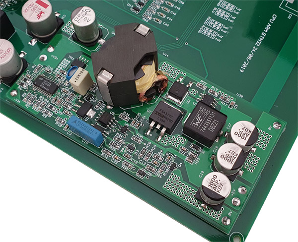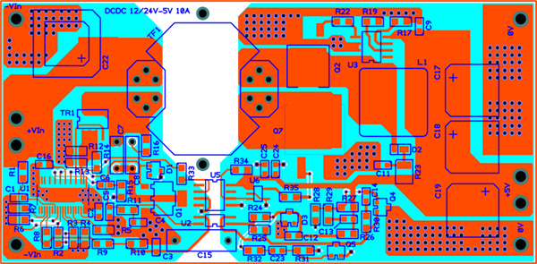 Il convertitore è stato implementato su 2 layers, con rame da 35 μm (1 oz). Tutto il bottom è formato da due ground planes isolati.