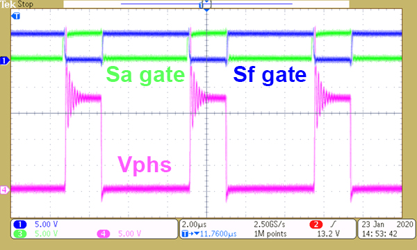 Osservando da vicino lo spegnimento di Sa (notare che, essendo un PMOS, il suo spegnimento avviene quando la traccia verde torna a 0 V), si nota il transitorio di quasi-ZVS (Zero Voltage Switching) dell'NMOS S al primario. Riassumendo quanto detto nella prima parte dell'articolo, il segnale di accensione di S (in blu) è attivato quando la sua Vds è prossima agli 0 V: la scarica della capacità del nodo di phase è data dalla corrente nell'induttanza di magnetizzazione del trasformatore, caricata tramite il clamp nella fase "a sinistra", in figura, ed estratta dalla Coss di S durante il dead-time dopo lo spegnimento di Sa. In parole ancora più semplici: la corrente nella magnetizzante del trasformatore assume un valore negativo (è positiva dal clamp verso l'alimentazione) mentre S è spento ed Sa è acceso; allo spegnimento di Sa, tale corrente non può fare altro che "passare" per S: all'inizio questo avviene tramite la capacità del MOS, e poi attraverso il suo diodo intrinseco.
