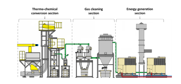 In the centre of the scheme of Figure 1 is depicted the gas cleaning section, carbon particles in the hot gas are filtered and then gas coolers and scrubbers remove tars.