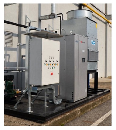 The YAZAKI WFC SC 20 absorption chiller unit is installed on a pre-engineered skid module by MAYA and use as the working fluid an aqueous solution of lithium bromide.