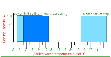 Come si può rilevare dalla stessa, la temperatura limite inferiore di mandata è di 5,5 °C e quella massima di ritorno è di 19,5 °C. Il campo di lavoro nominale è quello con mandata a 6,5 °C e ritorno a 10,5 °C (standard setting).