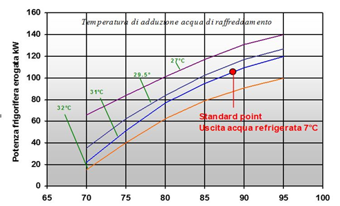 Di seguito vengono riportate nella figura le curve caratteristiche di mandata dell’acqua refrigerata, per temperatura di condensazione pari a 31 °C, in funzione delle diverse temperature dell’acqua di alimentazione. Come si può rilevare dalle stesse, la potenza frigorifera erogata corrispondente cresce all’aumentare dei valori di temperatura di erogazione fino a stabilizzarsi asintoticamente per i valori più elevati.
