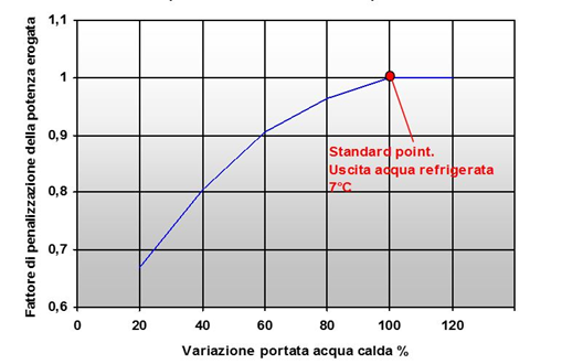 Da ultimo è stato illustrato sempre nella figura l’andamento del fattore di penalizzazione della potenza frigorifera per riduzione della portata dell’acqua di alimentazione, fermi restando i rimanenti parametri caratteristici di funzionamento.