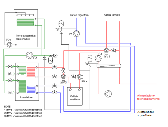 Nel caso di solo fabbisogno termico per riscaldamento, la valvola MV3 escluderà l’assorbitore.Allorché l’impianto di alimentazione termica venga posto fuori servizio per manutenzione od altro, la valvola MV2 provvederà a deviare tutto il fluido termovettore verso la caldaia ausiliaria, allo scopo di soddisfare comunque l’utenza. La stessa, ovviamente, dovrà essere in grado di fornire l’acqua calda alle temperature e nelle quantità di progetto.