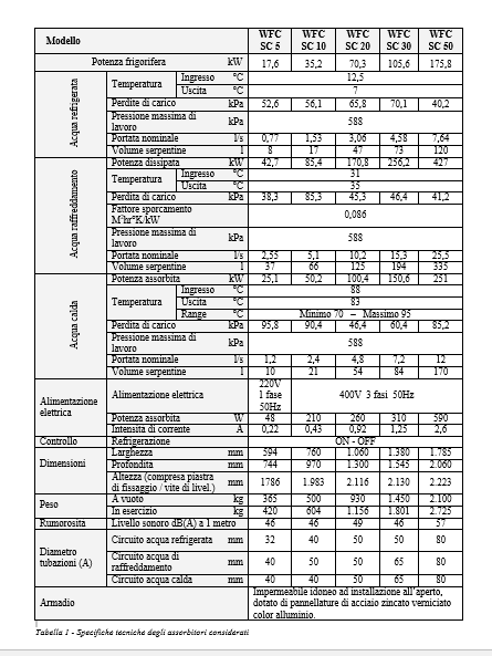 Le prestazioni termodinamiche nominali degli assorbitori in esame sono sintetizzate dal coefficiente di prestazione COP - altrimenti EER / Energy Efficiency Ratio - che è il rapporto fra potenza frigorifera ricavata e quella termica utilizzata, il cui valore è pari a 0,7.