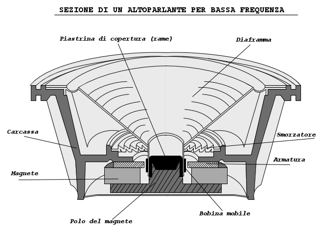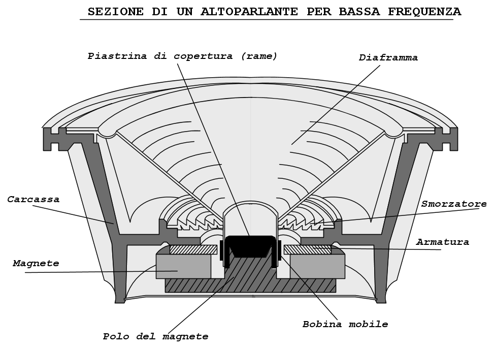 In genere l'altoparlante per le basse frequenze ha un cono grande e pesante come altrettanto la sua carcassa, e prende il nome di woofer, a differenza del tweeter che è un trasduttore per le alte frequenze è più piccolo e leggero, questi due componenti insieme realizzano quelli che sono i diffusori acustici per applicazioni audio,nel caso specifico del tipo a due vie (alte e basse frequenze).