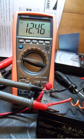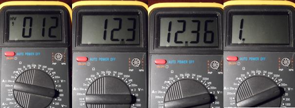 Considerando ancora la misura della tensione ai capi dell’accumulatore immaginando di non conoscere il valore si prenderà la portata maggiore in dc, in questa prova ho utilizzato (GBC KDM350CTF) che mi permette di selezionare la portata iniziando da quella di 1000 V. Eseguendo la misura apparirà sul display la cifra “012” V, volendo avereuna lettura migliore si passa alla portata di 200V ottenendo la cifra di “12.3”V quindi un valore decimale, fino apassare alla portata adatta di 20 V con il risultato sul display di “12,36”V con due decimali quindi una lettura più “precisa”.