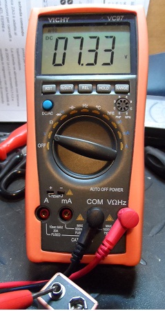 Nel disegno il multimetro riporta il valore di 12,57 Vdc misurato ai capi di un accumulatore (12 V 1,3 Ah) di tensione nota.Il valore misurato risulta essere maggiore della tensione nominale in quanto la batteria è a vuoto ovvero non ha alcun carico collegato,le immagini di seguito riportano oltre l’esempio disegnato anche quello di una batteria convalore 7,33 V inferiore a quello noto di 9V nominale, questo indica che la batteria in misura è scarica…