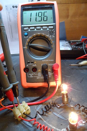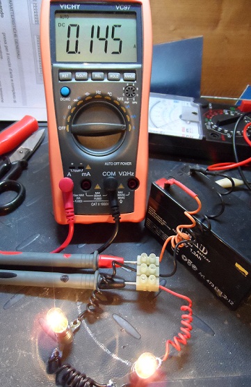 se si prova ad alimentare con l’accumulatore di 12 V un circuito serie composto da due lampadine mignon di 6,3 V 150 mA (un piccolo carico..) e si misurerà ancora la tensione ai capi della batteria si avrà un nuovo valore di 11,96 V inferiore alla sua tensione nominale, ed indica la non perfetta carica della batteria..