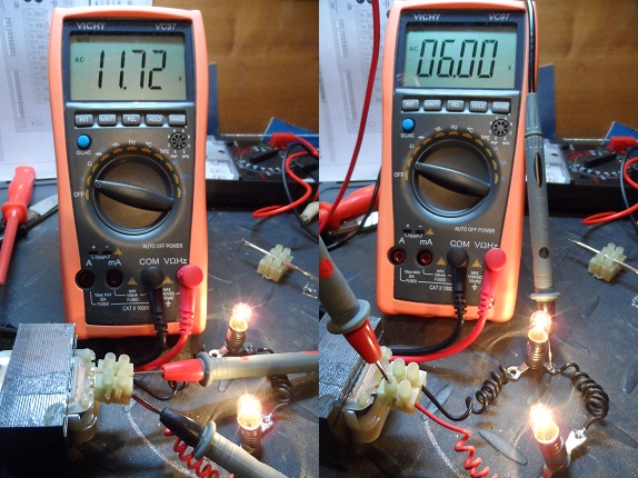 Alimentando questa volta il circuito composto da due lampadine serie con la tensione del secondario del trasformatore, si misurerà ai capi della serie una tensione di 11,72Vac e fra le due lampade quella di 6Vac...