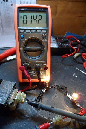 Considerando ancora il circuito composta da due lampadine serie, ed alimentandolo una volta in dc ed una volta in acsi inserirà in serie al circuito il multimetro in funzione amperometro selezionando sullo strumento la grandezza A ed utilizzando la portata 10A supponendo incognito l’assorbimento del circuito,e non preoccupandosi della portata avendo questo strumento la funzione auto range .Si leggerà sul display la misura in dc di 0,145 A ed in ac di 0,142 A rispettivamente di 145 mA e di 142 mA.