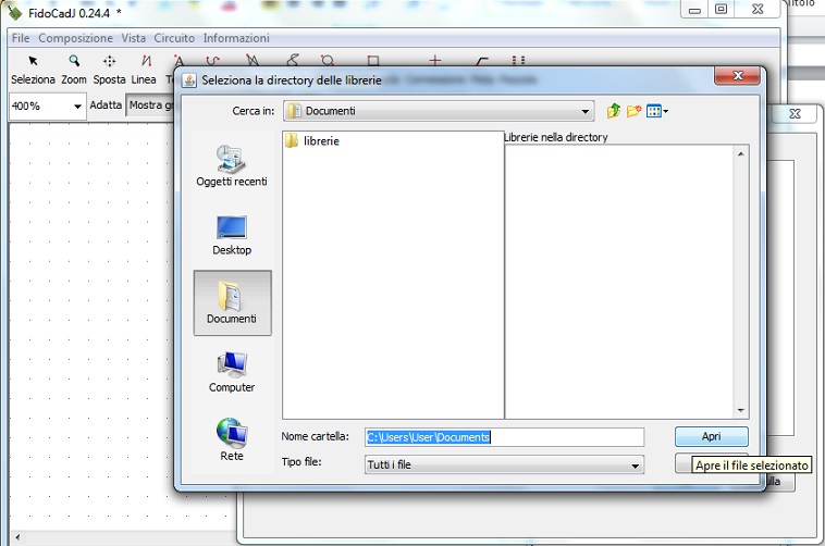 Ora utilizzando il pulsante Sfoglia andrò a cercare la mia cartella librerie e confermerò con il pulsante Apri ,e poi ok a questo punto FidoCadJ è pronto per realizzare la nuova libreria Industriale (nome che assegnerò alla nuova libreria come vedremo avanti) con i nuovi simboli