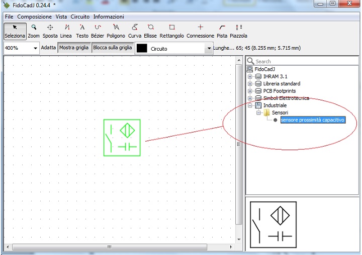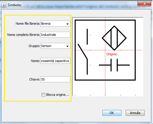 - nome, il nome proprio del simbolo o meglio in questo caso del sensore,e cioè sensore di prossimità capacitivo, avrei potuto anche scrivere proximity capacitivo abbreviando il testo,ma questo dipende dalle nostre esigenze e-o scelte di rendere più fruibile la libreria