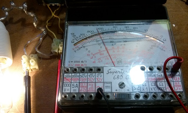 misura dell'assorbimento in ac di una lampada ad incandescenza (25V 25 W) alimentata alla tensione di 24 Vac con inserimento in serie del multimetro ICE680G in portata amperometrica ac con fsc 2,5 A
