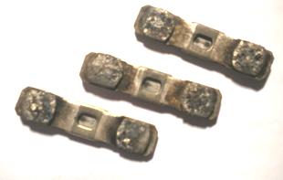 Nell'immagine, i contatti mobili di un contattore di potenza danneggiati, adibito al comando di un carico resistivo di considerevole potenza (stella di resistori di 1500 W di un forno, alimentazione trifase 400 V 50Hz), contatti che potenzialmente sono destinati a rimanere incollati (saldati) con i contatti fissi, se non preventivamente sostituiti. Non è raro nelle manutenzioni trovare contattori impiegati su carichi con caratteristiche di esercizio "pesanti" per i quali richiedono verifiche periodiche, con altrettante sostituzioni dei contatti con superfici deteriorate.