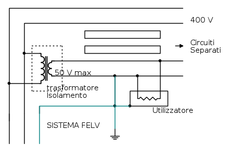 Nel sistema FELV queste non devono inserirsi in altre prese alimentate con altre tensioni e viceversa per le spine di altri circuiti. Qualora nel sistema FELV venga a crearsi la condizione di guasto, dovuto alla perdita d’isolamento del componente, la massa assumerà un potenziale intorno ai 220V verso terra, obbligando pertanto come già detto a predisporre le protezioni contro i contatti indiretti per mezzo di: collegamento delle masse del circuito FELV al conduttore di protezione del circuito primario quest’ultimo protetto da interruzione automatica dell’alimentazione, o collegando le masse del circuito FELV al conduttore equipotenziale isolato non connesso a terra, in quei sistemi dove è utilizzata la separazione elettrica.