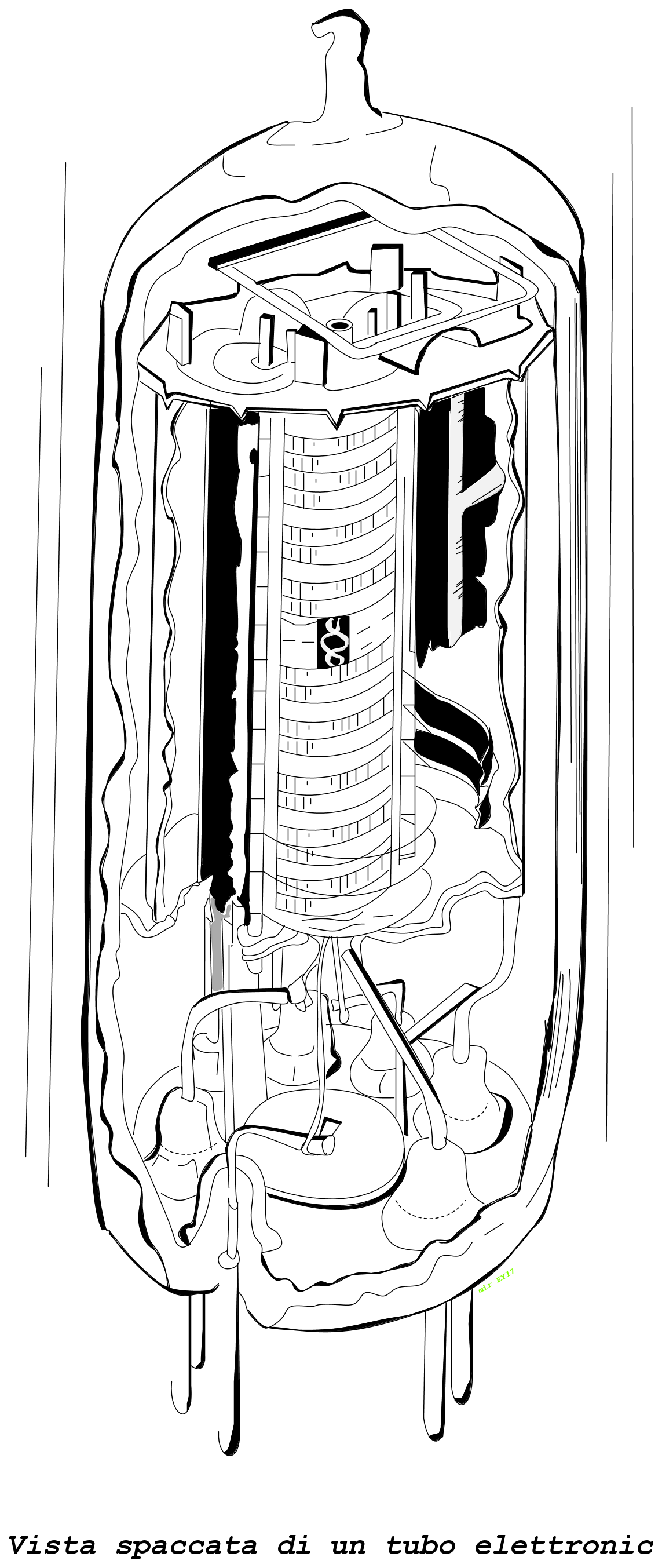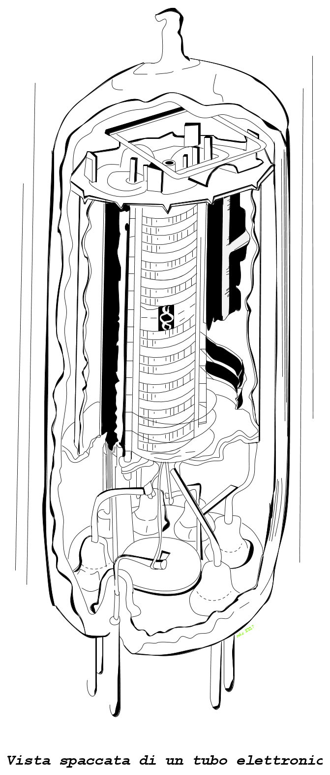 Il tempo dedicato al disegno del tubo elettronico, mi lascia poco spazio, solo per una sua breve descrizione (anche perché non saprei scrivere di più ).