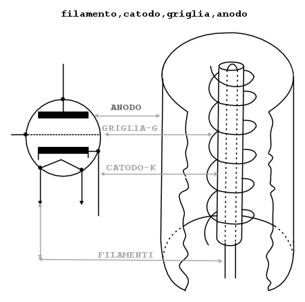 La classificazione delle valvole, è fatta sulla base del numero di elettrodi presenti, quindi si parte dal diodo con due elettrodi, al triodo con tre elettrodi, al tetrodo e via a seguire fino alle valvole multiple, cioè costituite da valvole assiemate in un'unica ampolla di vetro. E dopo tante parole, ecco il disegno/ esempio, non ben riuscito ma sufficientemente rappresentativo, per rendere l’idea ...in versione large ..