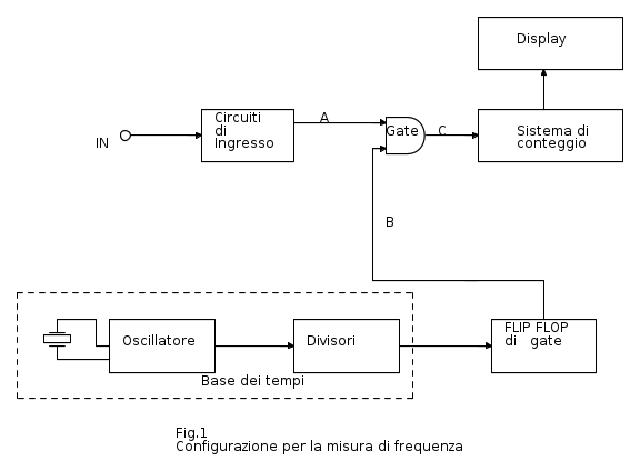 Il segnale, di cui si vuole misurare la frequenza, è applicato al morsetto di ingresso, denominato IN, ed entra nel blocco denominato "CIRCUITI DI INGRESSO". All' interno di questo blocco avviene il "condizionamento" del segnale cioè viene reso di forma squadrata, di ampiezza adeguata e con tempi di salita idonei, questa manipolazione è resa necessaria per fare in modo che un segnale anche sinusoidale possa essere utilizzato per le operazioni successive. Il segnale così ottenuto, di forma impulsiva ( ogni impulso equivale ad un periodo del segnale di ingresso ), entra in uno dei due ingressi del GATE AND ( segnale A ). Nell' altro ingresso della porta AND entra un segnale, proveniente da un flip flop tipo SR chiamato FLIP FLOP DI GATE, di livello alto, rettangolare ( segnale B ) della durata di un secondo quindi questo segnale viene utilizzato per abilitare la porta in modo tale che in uscita si avranno un numero di impulsi proporzionale al tempo di abilitazione ( segnale C ).