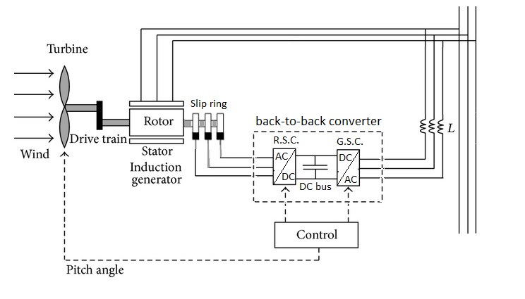 Il rotore avvolto è elettricamente connesso ad un raddrizzatore a commutazione forzata lato macchina (Rotor Side Converter), grazie a degli anelli collettori sui quali scorrono le spazzole. Il R.S.C. ha lo scopo di assorbire una corrente quanto più possibile sinusoidale a frequenza di scorrimento fr e consente la regolazione del livello di tensione nel circuito in continua.