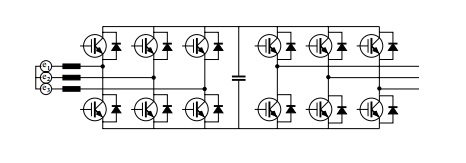 Il sistema costituito da questi due convertitori è un convertitore di frequenza comunemente chiamato back-to-back converter; esso è completamente reversibile, in quanto permette al flusso di potenza di fluire dagli avvolgimenti rotorici alla rete o viceversa. Nella figura seguente ne viene riportato un dettaglio, i dispositivi a semiconduttore, controllabili allo spegnimento, possono essere IGBT o BJT.