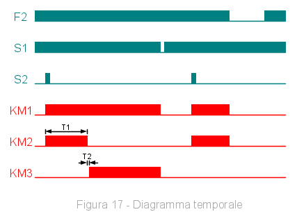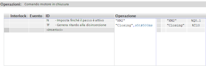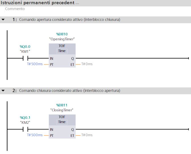 Ho voluto interbloccare i due teleruttori del motore, in modo da evitare in particolare l'inversione di direzione immediata nel caso di oscuramento della fotocellula della transizione T5, per fare questo ho aggiunto due timer alla disinserzione nella sezione "istruzioni permanenti precedenti", ovvero che vengono eseguite continuamente prima della catena: