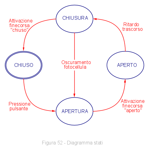 immaginiamo un portone basculante, mosso da un motore nelle due direzioni di apertura e chiusura, con corrispondenti finecorsa di raggiungimento della posizione; l'apertura viene comandata da un pulsante mentre la chiusura avviene automaticamente dopo un minuto. Una fotocellula, se rileva ostacoli durante la fase di chiusura, interrompe il comando riaprendo automaticamente il portone.
