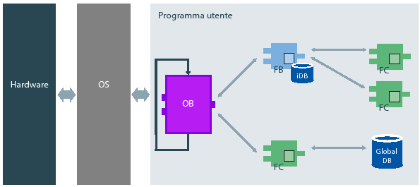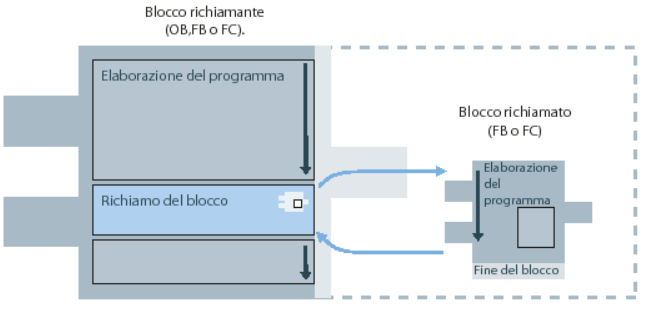 Come per le FC, i blocchi funzionali possono essere richiamate più volte ed in punti diversi, direttamente dal programma principale o da altre FC/FB e possono accedere alle variabili globali (DB o merker).